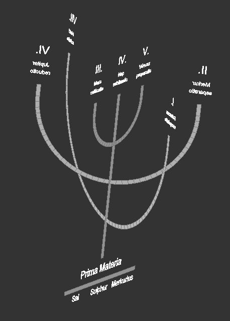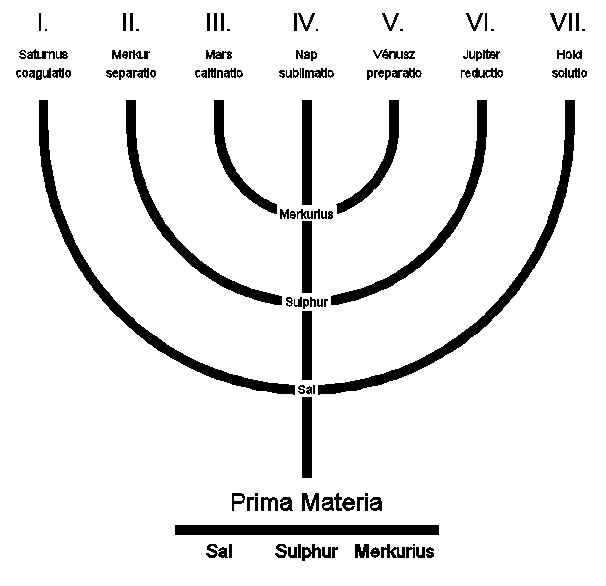 Úgy gondolom, hogy a Teremtés fókuszpontját és kiáradását megérthetjük az eddig elmondottak alapján. A Teremtés folytonosan zajló mágikus képkivetítés. Itt nem látható, hanem szellemi képekre kell gondolni. A Teremtés tehát a Mágikus Tükrön át kiáradt, és a létében Egy, személyében Hármas Isten ezzel belépett az elválaszthatóságba, de ezt csak úgy szabad érten, hogy Istennek a kinyilatkoztatott „része” lép az elválaszthatóságba, a Szentháromság pedig marad a „helyén” és kell is, hogy maradjon, hiszen a Teremtés nem olyasmi, ami egyszer megtörtént, aztán úgy maradt. Nem! Isten folytonosan szüli a Teremtett Világot, e nélkül nem lehetne semmi. Kicsit megint előre kell szaladjunk, hogy a Mágikus Tükrön át való kiáradás után következő dolgokat nagy vonalakban a helyükre tegyük. Ahogyan az előző két ábra mutatja, a kiáradás után először Isten ismét egy hármas képben kell megfogalmazza magát. E hármasság szintén egységes, a neve Príma Matéria. Ez természetesen nem megfogható anyag, hanem a Teremtés „szellemi” alapanyaga. Azt is fontos tisztázni, hogy az Első Teremtés tisztán szellemi volt, az anyag csak később keletkezett. A Príma Matériát három alapvető minőség alkotja, melyek tökéletes egységben állnak, s ugyanúgy elválaszthatatlanok egymástól, mint a Szentháromságban az Atya – Fiú – Szent Szellem. Mindegyiknek meg van a maga külön feladata és lényege, és egymást folytonosan áthatják, folytonosan egymásba alakulnak. Ezt, az egymás közös áthatását nevezi Böhme Inqualieren-nek. Az inqualieren olyan áthatása, egyesülése az elemeknek, melynek során minden elem megtartja a maga intaktságát (mondhatnák: önálló identitását), és mégis tökéletes és szétválaszthatatlan egységet alkotnak. A Príma Matéria három alapminősége ilyen egységet képez. A Szent Szellem a Príma Matériát alakítani kezdi, és így sorban kilépnek belőle az első Szellemi Teremtés mágikus alapképletei. Ezekből hét van. Ezek olyan Műveletek, Számok, vagy Teremtő Képek, centrumok, melyek lényegük szerint szintén elkülönülnek, azonban együtt közösen és szétválaszthatatlanul alkotják (inqualieren) az első Szellemi Teremtést. Ezen első, tisztán szellemi Teremtés még nem a teremtett, látható, anyagi világ. A számunkra érzékelhető anyagi világ ennek az első Teremtésnek a kivetülése és darabrabokra törése, mely a bűnbe esés következménye. De erről később részletesen szó lesz. Most térjünk vissza a Príma Matériához. A három alapminőséget minden hagyomány más néven nevezi meg, és nem is szabad a különböző hagyományok alapminőségeit egymásnak egyenlősítéssel megfeleltetni, de az minden hagyományban közös, hogy három van. Ez teljesen logikus, mivel a Príma Matéria, mint minden, a Szentháromságból sugárzott ki, tehát háromnak kell lennie. Az Alkímiában a három alapminőség a következő: Sal, Sulphur, Merkurius. A Véda szerint ugyanez a három: Tamasz, Radzsasz, Szattva. Kínában: Jin, Jang, Jen. Ezek nem keverendők össze a négy elemmel. Gyakran elkövetik ezt az összezavarást, pedig a három alapminőségből az isteni Hármasság mintájára három van, a négy elem pedig négy. A négy elemről egyenlőre csak annyit, hogy a Príma Matériából először kilép a Teremtés Hét Alapképlete, a négy elem csak később, ezekből keletkezik. A fentebb felsorolt hagyományok közül Böhme alapján az Alkímiára fogunk támaszkodni, aminek az alapja, a valószínűleg Egyiptomból származó Hermetikus hagyomány. A Príma Matéria három alapminősége tehát: Sal, Sulphur, Merkurius. A Sal nem egyenlő a sóval, de a világban a só a Sal analógiájaként nyilatkozik meg. Az analógia nem hasonlat, hanem megfeleltetés. Az analógia az archaikus kor (történelem előttinek mondhatnánk, a Hagyomány kora) gondolkodásának alapja. Arról van szó, hogy a világban látható dolgok visszavezethetők a Teremtés szellemi alapképleteire. Például: a háborúskodás, az erőszak analógiája a vörös szín, a vörös szín analóg a Mars bolygóval, ez analóg a fémek közül a vassal, és így tovább. Az analógia sorok végül mindig az Első Szellemi Teremtés Hét Alapképletére vezethetők vissza, de nem szabad azt a hibát elkövetni, hogy a négy elem valamelyikére, vagy a Három Alapminőség valamelyikére vezetjük vissza, ez ugyanis csak összezavarodást okozhat. A Príma Matéria Isten Hármasságának a mintájára tehát Sal – Sulphur – Merkurius szétbonthatatlan hármas egysége, melyből a Hét Alapképlet (Szám, centrum, Művelet) az alábbi ábra szerint lépett ki: