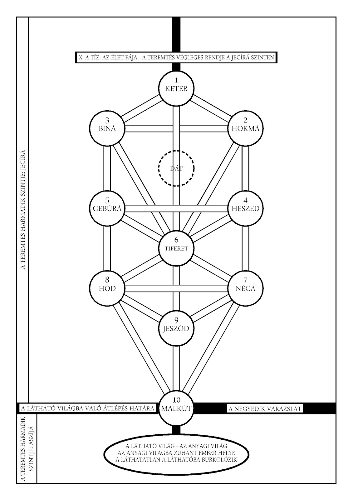 Az első lépcső a Nyolcadik Művelet, melyet úgy foghatunk fel, mintha az Első Szellemi Teremtés hetese egy gödörbe zuhant volna. A Nyolcadik Művelet a KETTŐ harmadik megnyilatkozása, mint összetörés, összesűrűsödés a következő kiáradás előtt. A második lépcső a Kilencedik Művelet, ami a HÁROM következő megnyilatkozása. A Kilenc a hármasság megháromszorozódás, vagyis az Első Szellemi Teremtés három részre szakadása. A három elkülönült világ három olyan világ szféra, melyeket a Bukás után a sötétségbe zuhant embernek be kell járnia, hogy Istenhez ismét eljusson. A harmadik lépcső pedig a Tíz, ami a Teremtés Bukás utáni végleges „alakjának” a képe. Megjelenési formája a kabbalista életfa. Akik a kabbalában jártasak, azok mindjárt a szememre vethetik, hogy a Teremtés négy szintje, az acílút, a beríjá, a jecírá és az aszíjá az álltalam ábrázolt sémában úgy helyezkednek el, hogy a Varázslatok választják el őket, s így az életfa, vagyis a Tíz a jecírá szintjébe kerül, holott a kabbalisták a négy szintet az életfán belül különítik el. A kettő nem zárja ki egymást. A Teremtés minden lépcsője magában foglalja az előző lépcsőket is. Így a négy szint értelmezhető a Teremtés teljes folyamatára, és a jecírá szinten az életfa egyes részeire is. Aki követte a számolást, az észreveheti, hogy a nagy számsorból kimaradt az Öt és a Hat. Nos ahogyan Hamvas mondja, a három az egész, a négy a teljesség, a tíz pedig a mindenség száma. Az őt pedig a teljesség fele, vagyis az öt a tíz feleződése, vagyis a Teremtés megtörése, szakadéka. Az Öt tehát lehetne a Bukás száma, de csak az Öt negatív értelmében. Ezen értelemben a legsötétebb dologról van szó. A negatív KETTŐ a szakadás száma, a negatív Öt azonban a sátáni aktus száma, melynek jele a csúcsával lefelé fordított pentagramma. A pozitív Öt és Hat a Teremtés sémájában nem alkotnak önálló állomást, ezért nem ábrázoltam őket. Mélyebb jelentésük eddig még nem világosodott meg előttem. Úgy sejtem, hogy a Teremtésben rejtetten működő erőket jelentenek.
