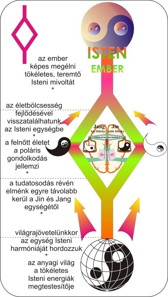 Ezen a korábbi ábrán az ember, a kétpólusú világ, a Föld szülötteként magában hordozza az Isteni egység tudását; ezt a teljesség-tudást ~3 éves korunkban, a tudat kitárulkozásával elveszítjük, (az Y szétnyílik) midőn megtanítanak minket a jó és a rossz szétválasztására; majd a figyelmesen értelmező ember felismeri, hogy a teremtet világban a Jang jóság és a Jin gonoszság külön nem értelmezhetőek, és megtér Isten egységébe. A rovásjelek ugyanezt jelentik, de csak, ha egymásra helyezzük őket: